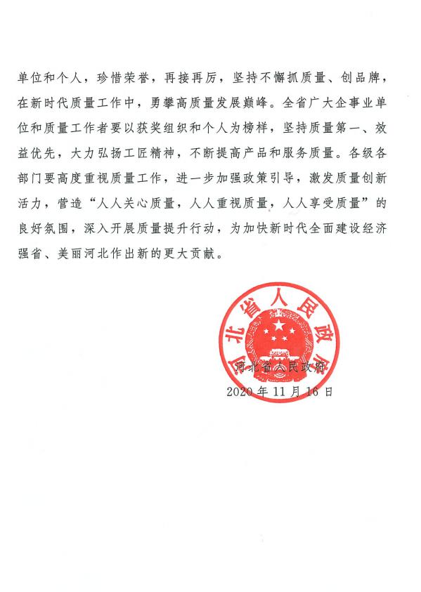河北省政府質(zhì)量獎(jiǎng)是河北省政府為全面推進(jìn)質(zhì)量強(qiáng)省建設(shè),引導(dǎo)和激勵(lì)全省各行各業(yè)加強(qiáng)質(zhì)量管理,追求卓越績(jī)效,實(shí)現(xiàn)高質(zhì)量發(fā)展而設(shè)置的質(zhì)量榮譽(yù)最高獎(jiǎng)項(xiàng),此次趙楠女士獲此獎(jiǎng)項(xiàng),既是對(duì)她兢兢業(yè)業(yè)、勤勤懇懇、扎扎實(shí)實(shí)開(kāi)展質(zhì)量管理工作的表彰,也是對(duì)我集團(tuán)公司不斷追求卓越績(jī)效,增強(qiáng)自主創(chuàng)新能力和市場(chǎng)競(jìng)爭(zhēng)力,提升質(zhì)量總體水平工作的肯定和認(rèn)可。